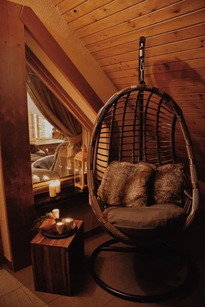 Apartament ma nowoczesne, wysokiej klasy wykończenie w jasnych i ciepłych barwach. Wnętrze uzupełniają drewniane meble stylizowane na styl zakopiański oraz fotografie architektury Stanisława Witkiewicza. -