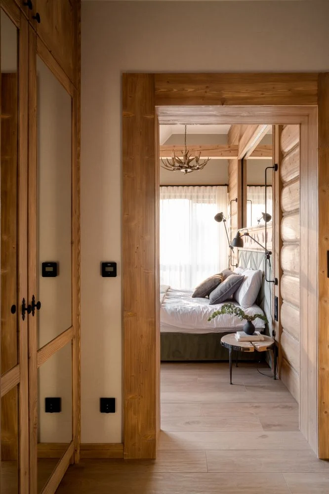 Pokój wyróżniają unikalne dodatki inspirowane naturą, m.in. lustra w formie dziupli, dekoracje z motywem kruków oraz rzeźbione szyszki, które podkreślają regionalny styl. -