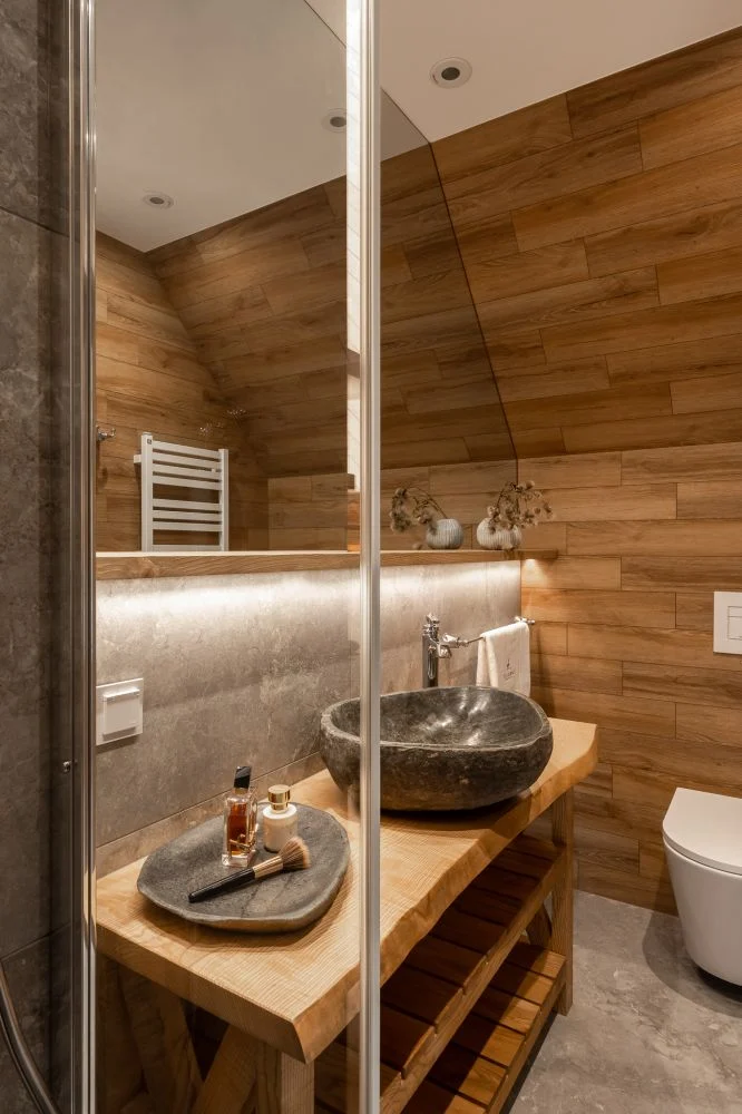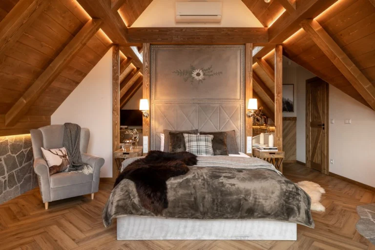 Wnętrze utrzymane jest w stylu chalet z rustykalnym charakterem: dominują drewniane wykończenia i kamienne detale, które budują ciepłą, przytulną atmosferę. -