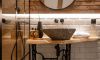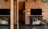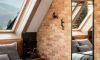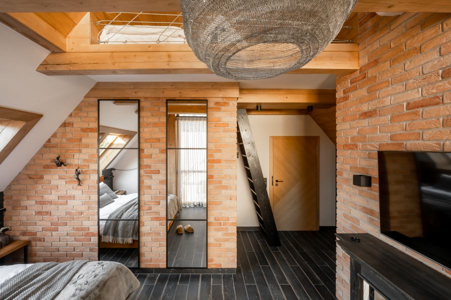 Centralnym punktem wnętrza jest elegancki kominek, w którym palą się duże świece, oferując romantyczne oświetlenie i klimat sprzyjający odpoczynkowi. Antresola z pojedynczym łóżkiem na poddaszu to idealne miejsce na chwilę intymności i spokoju. Klimatyczna łazienka, urządzona w tym samym stylu, zachwyca nowoczesnym prysznicem oraz dodatkami podkreślającymi loftowy charakter przestrzeni.