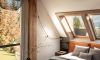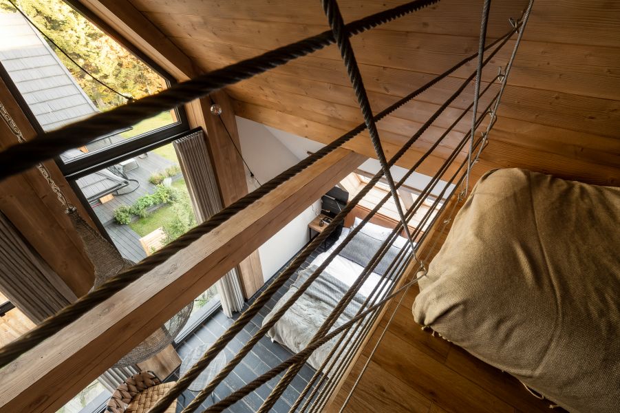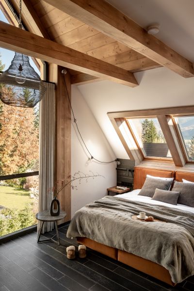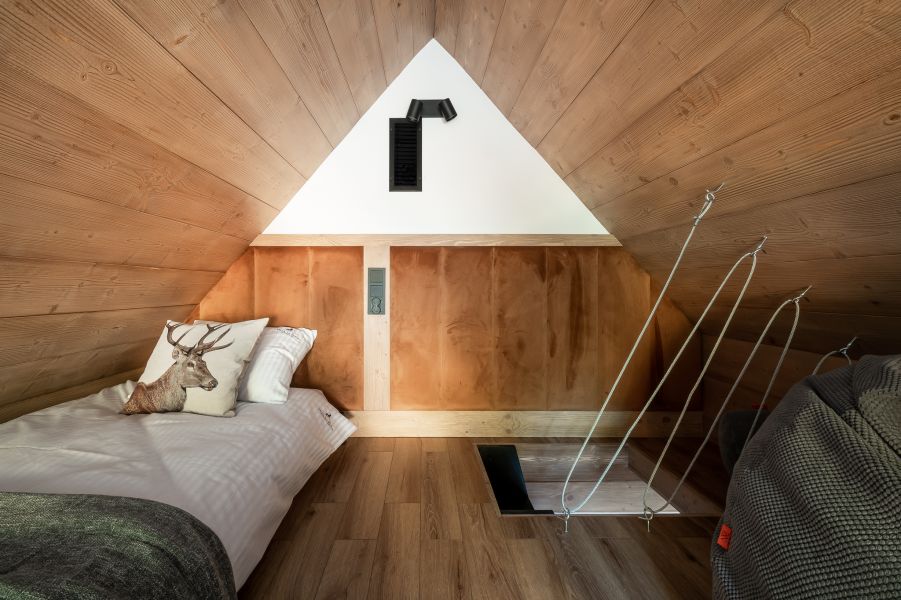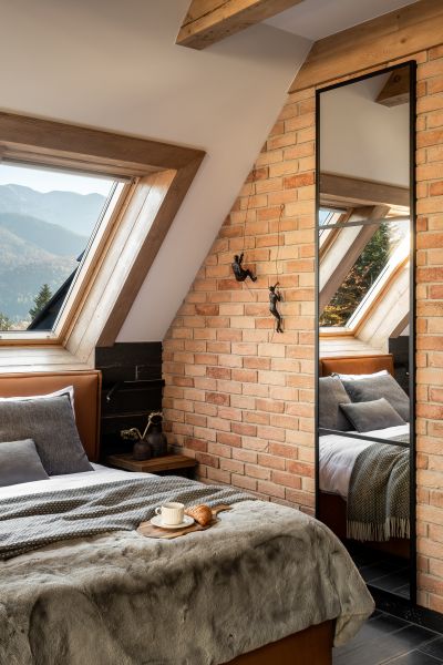 To miejsce staje się doskonałym schronieniem, w którym surowe elementy loftowego stylu harmonijnie współistnieją z miękkimi i ciepłymi dodatkami, tworząc atmosferę pełną kontrastów i relaksu. Przez dachowe okna sypialni zagląda Giewont, co dodaje wnętrzu wyjątkowego uroku i widoku na góry.