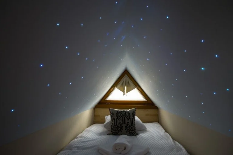 Wnętrze łączy luksusową nowoczesność z regionalnymi detalami. Rzeźbione łóżka, drewniane elementy oraz podświetlenia LED na wysokich skosach tworzą wyjątkowy, górski klimat. -