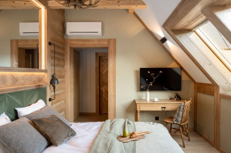 Pokój wyróżniają unikalne dodatki inspirowane naturą, m.in. lustra w formie dziupli, dekoracje z motywem kruków oraz rzeźbione szyszki, które podkreślają regionalny styl. -