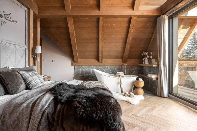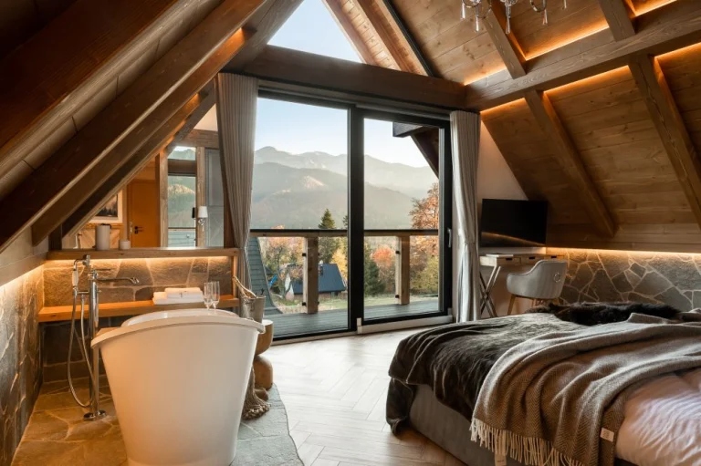 To pokój w stylu chalet z dużym przeszkleniem od podłogi do sufitu oraz luksusową wanną z widokiem na góry. Wnętrze łączy drewniane elementy i kamienne akcenty, tworząc rustykalny klimat sprzyjający relaksowi. -