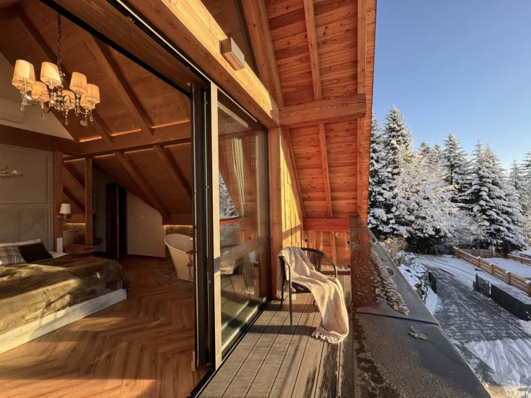 Wnętrze utrzymane jest w stylu chalet z rustykalnym charakterem: dominują drewniane wykończenia i kamienne detale, które budują ciepłą, przytulną atmosferę. -